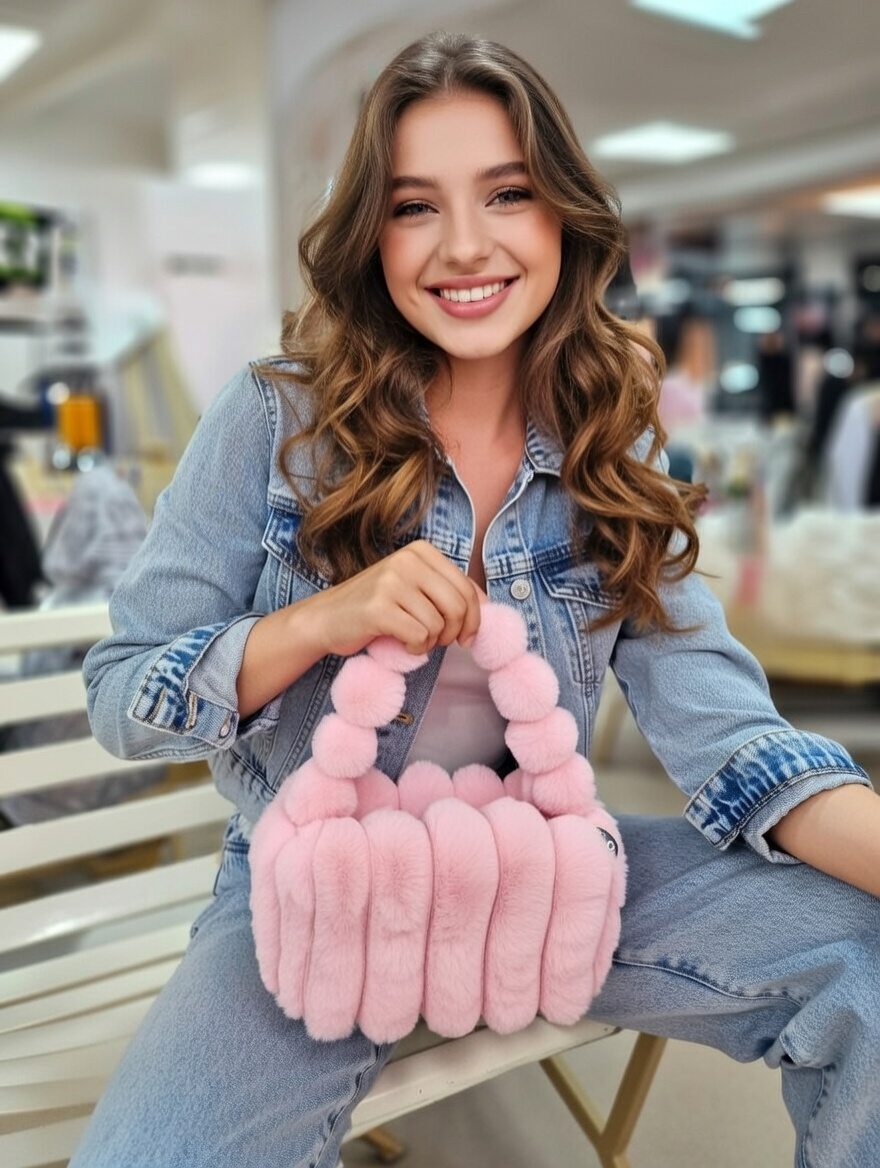 This playful pink faux fur handbag captivates with its fluffy pom-pom handle and vertical plush fur panels, creating a soft, cloud-like texture that feels irresistibly cuddly.