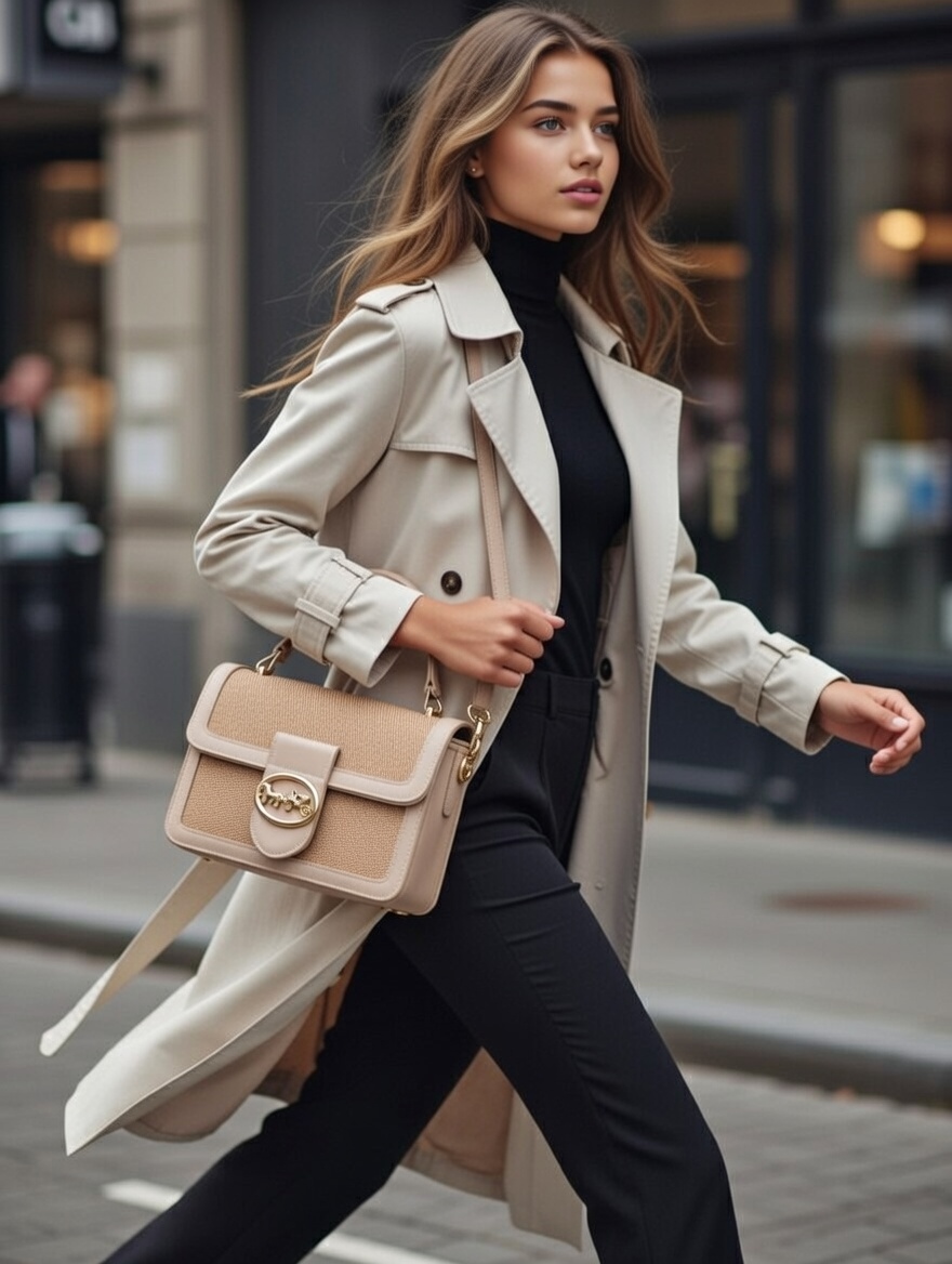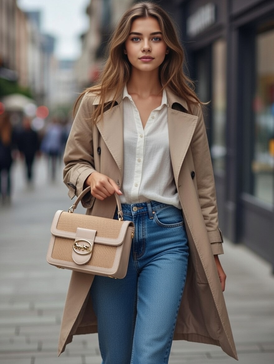 This sophisticated beige handbag features the iconic gold horse-and-carriage emblem on its front flap, blending classic Coach heritage with modern elegance. Crafted from textured fabric with clean lines and a structured silhouette, it offers a perfect balance of style and practicality for everyday luxury. Its compact size and top handle make it an ideal companion for both casual outings and chic gatherings, radiating timeless feminine appeal.