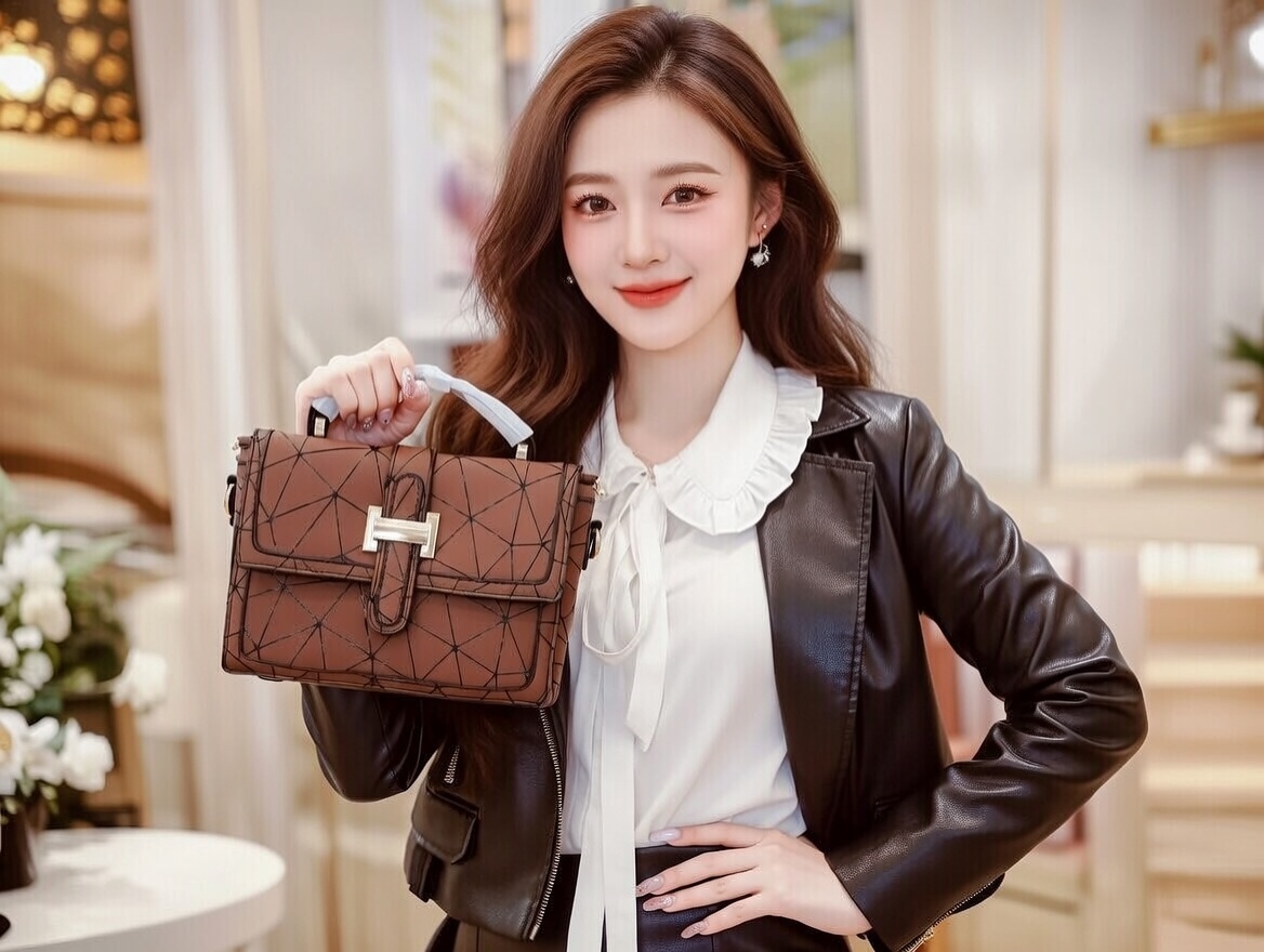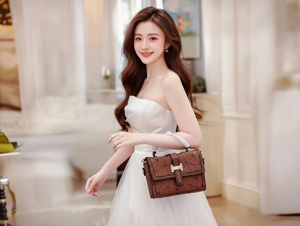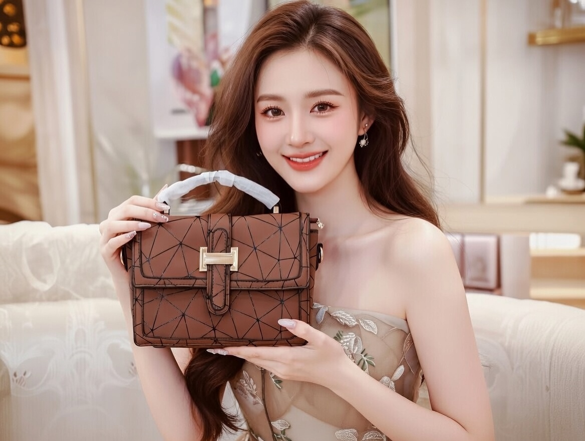 This chic brown handbag features a striking geometric quilted pattern with intersecting lines that create a modern, faceted texture, finished with a bold gold rectangular buckle closure for sophisticated contrast. The structured boxy silhouette, accented by a translucent crystal-clear top handle, blends contemporary design with luxurious appeal, making it perfect for evening events or elevated daytime looks. Compact yet spacious enough for essentials, this eye-catching piece effortlessly adds a touch of architectural glamour and refined femininity to any outfit.