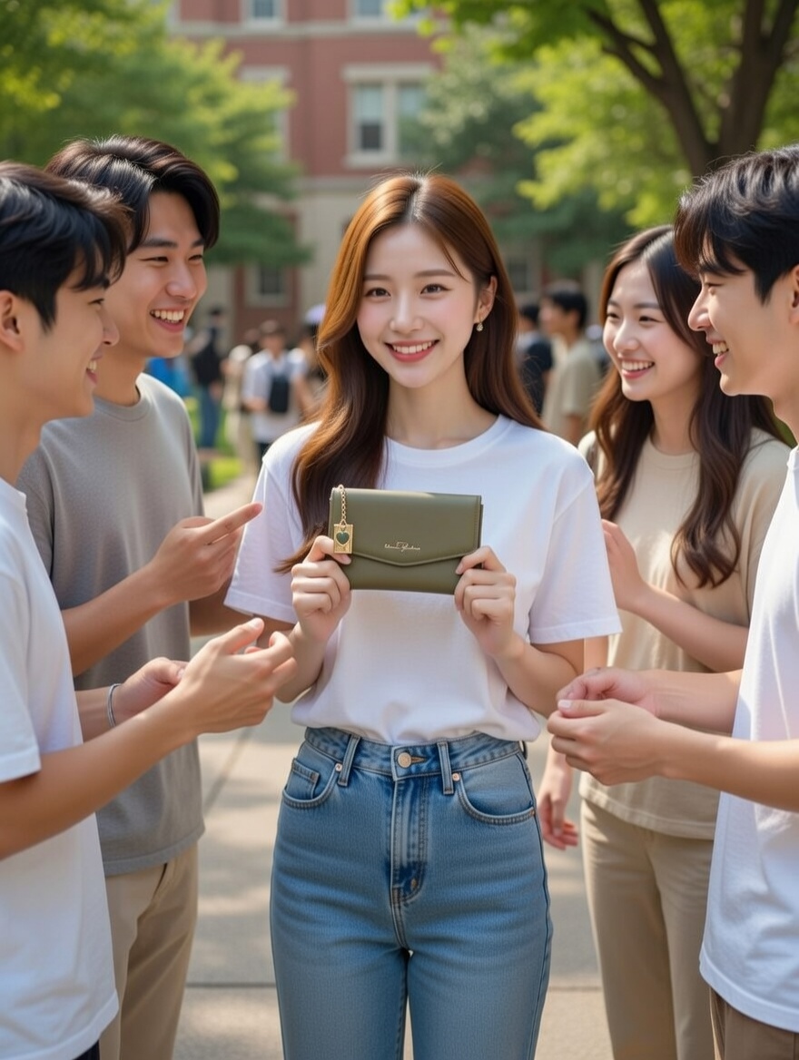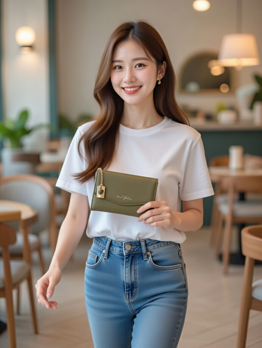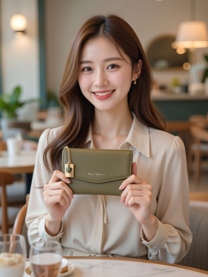 This elegant olive-green wallet features a sleek envelope flap with delicate gold stitching and a signature heart-shaped charm dangling from a delicate chain, adding a touch of romantic sophistication. Crafted from smooth, premium leather with clean lines and a slim, compact design, it combines understated luxury with practical everyday elegance. Perfect for the modern woman who appreciates subtle femininity, this timeless piece slips effortlessly into any handbag while bringing a warm, personal touch to your essentials.