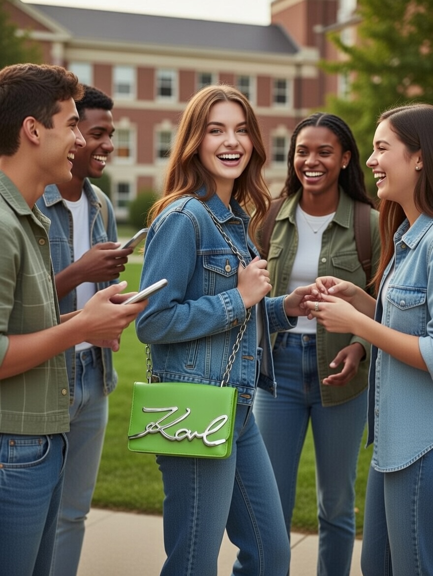 This vibrant lime-green Karl Lagerfeld crossbody bag stands out with its glossy leather finish and bold, oversized silver “Karl” script logo that gleams as a striking centerpiece