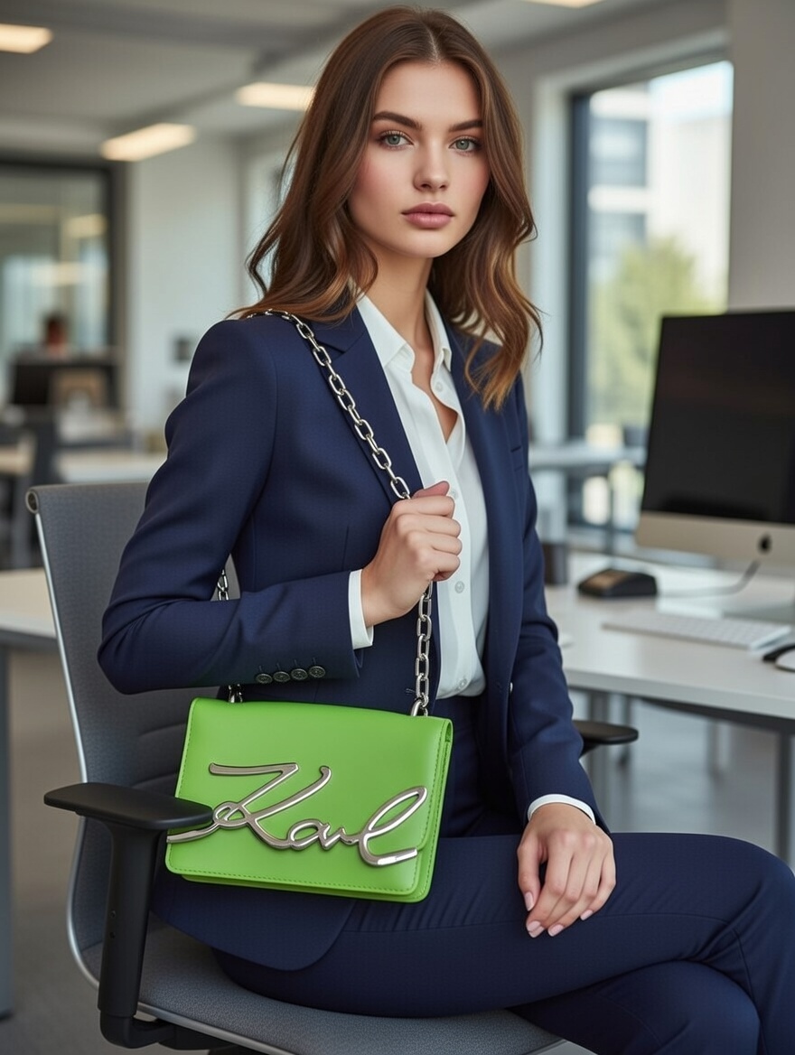 This vibrant lime-green Karl Lagerfeld crossbody bag stands out with its glossy leather finish and bold, oversized silver “Karl” script logo that gleams as a striking centerpiece. The classic rectangular silhouette is elevated by a chunky silver chain strap, blending edgy attitude with sophisticated Parisian chic. Perfect for adding a pop of playful luxury to monochrome outfits or casual city looks, this eye-catching piece delivers confident glamour and instant brand recognition.
