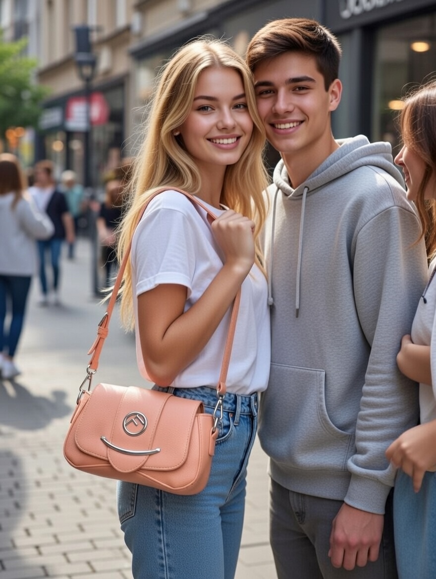 This soft peach saddle bag features a smooth faux leather exterior with a distinctive silver smile-like bar and circular logo clasp, offering a playful yet polished urban charm. Designed with an adjustable strap, flap closure, and compact size, it provides secure storage for essentials like phone, wallet, and keys on the go. Versatile for city strolls or casual outings, it adds a warm, feminine touch to neutral ensembles with its subtle sophistication and effortless style.